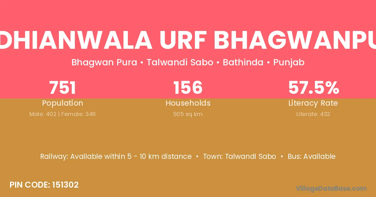 Gadhianwala Urf Bhagwanpura village has a total population of 751 people, of which 402 are males and 349 are females.