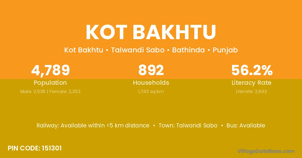 Kot Bakhtu village has a total population of 4,789 people, of which 2,536 are males and 2,253 are females.