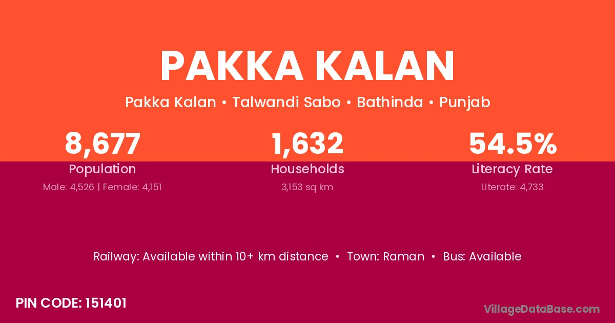 Pakka Kalan village has a total population of 8,677 people, of which 4,526 are males and 4,151 are females.