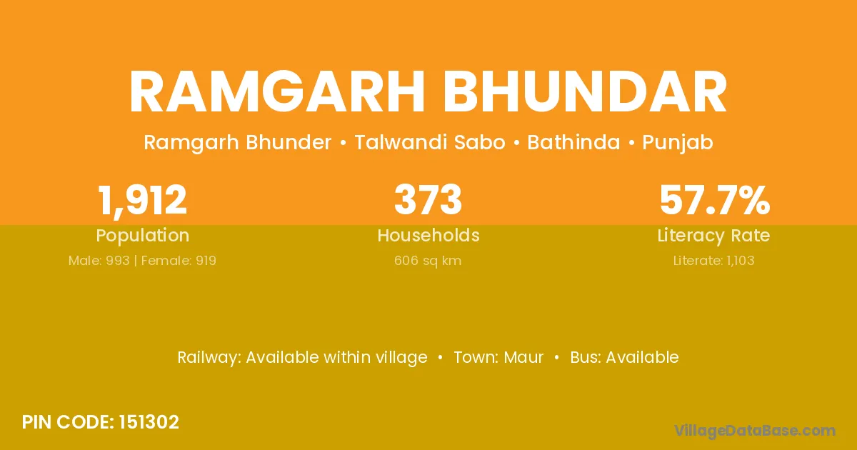 Ramgarh Bhundar village has a total population of 1,912 people, of which 993 are males and 919 are females.