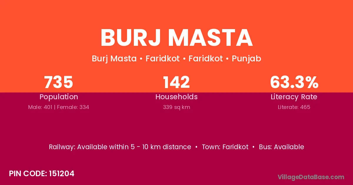 Burj Masta village has a total population of 735 people, of which 401 are males and 334 are females.