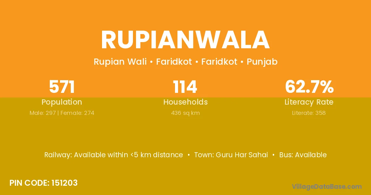 Rupianwala village has a total population of 571 people, of which 297 are males and 274 are females.