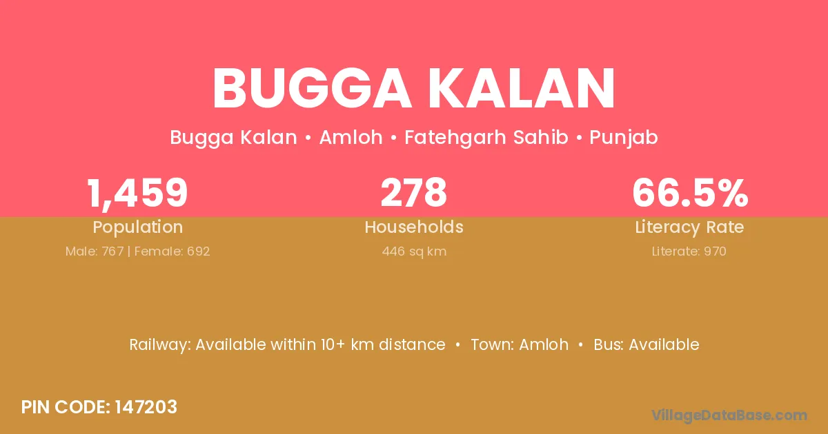 Amloh is the nearest town to Bugga Kalan village for major economic activities