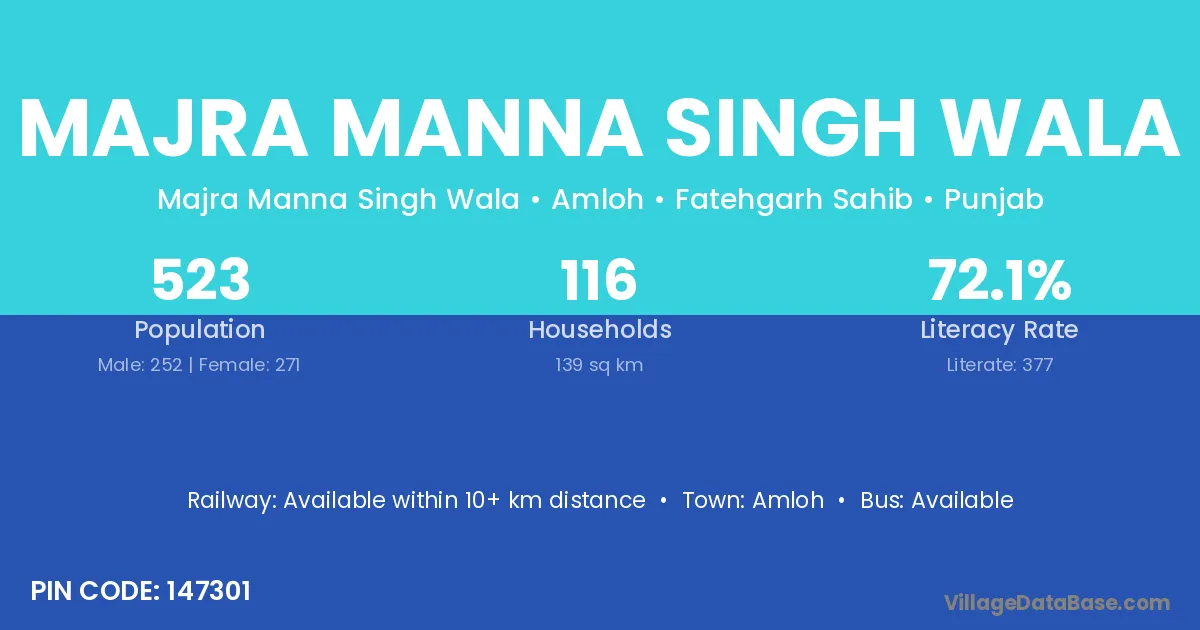 Majra Manna Singh Wala village has a total population of 523 people, of which 252 are males and 271 are females.