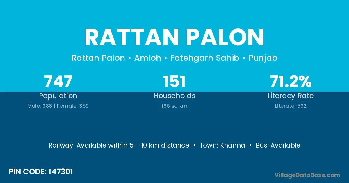 According to Census 2011 information, the village code of Rattan Palon village is 147301.