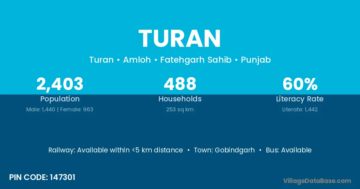 According to Census 2011 information, the village code of Turan village is 147301.
