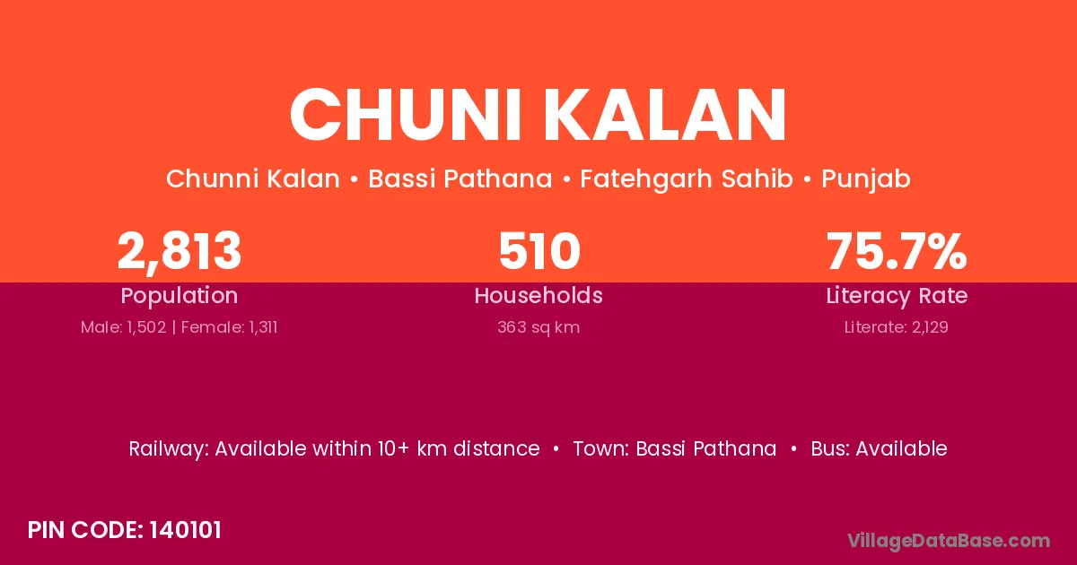 Chuni Kalan village has a total population of 2,813 people, of which 1,502 are males and 1,311 are females.