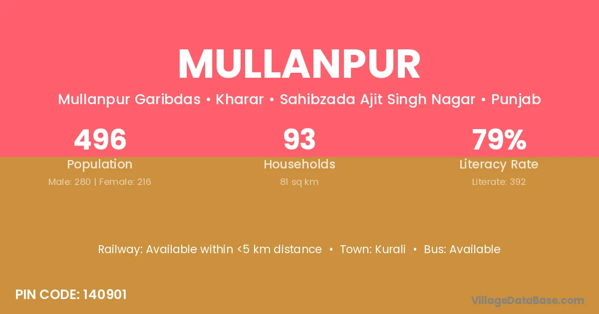The literacy rate of Mullanpur village is 76.20%. Male literacy stands at 79.88% and female literacy at 72.29%.