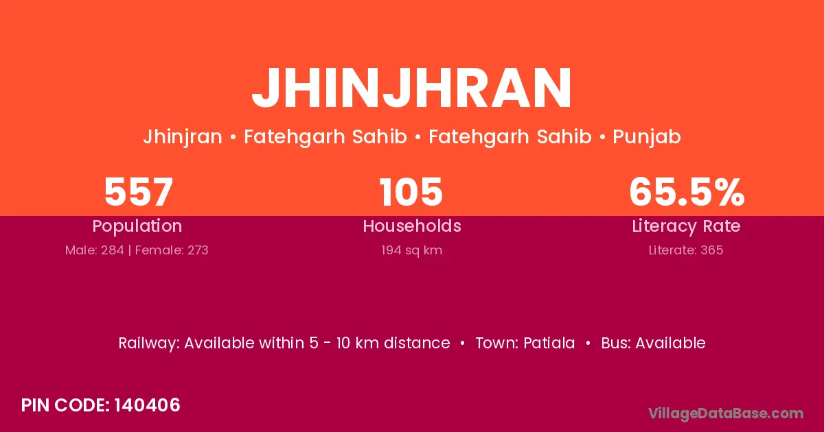 Jhinjhran village has a total population of 557 people, of which 284 are males and 273 are females.