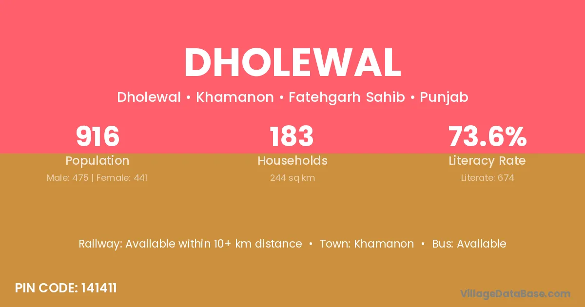 Dholewal village has a total population of 916 people, of which 475 are males and 441 are females.