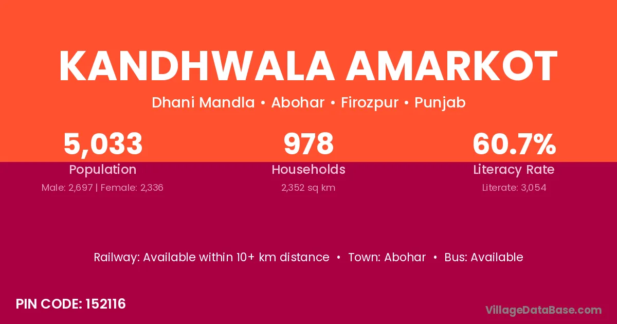 Kandhwala Amarkot village has a total population of 5,033 people, of which 2,697 are males and 2,336 are females.