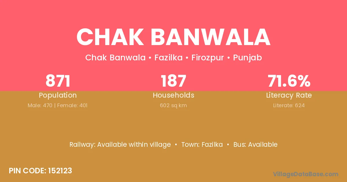 Chak Banwala village has a total population of 871 people, of which 470 are males and 401 are females.