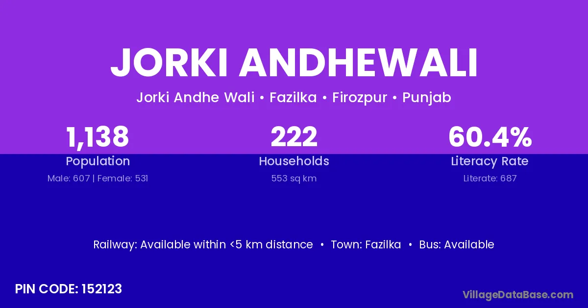 Jorki Andhewali village has a total population of 1,138 people, of which 607 are males and 531 are females.