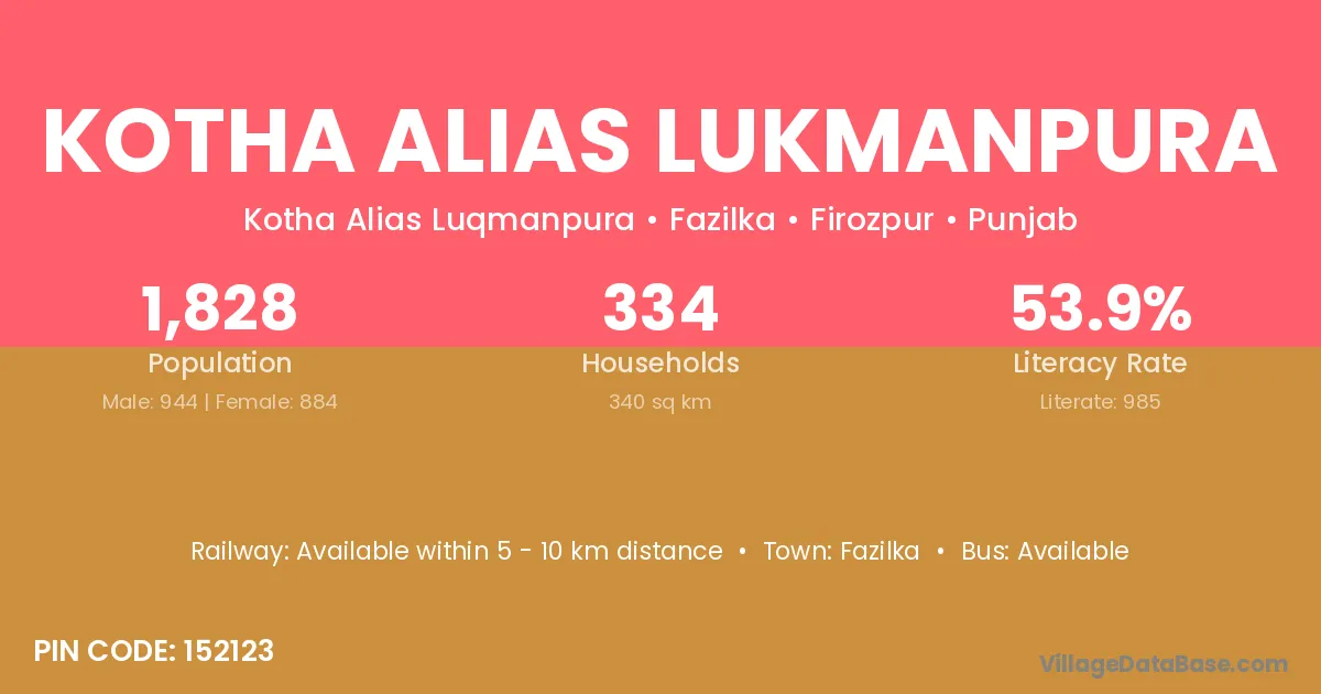 Kotha Alias Lukmanpura village has a total population of 1,828 people, of which 944 are males and 884 are females.