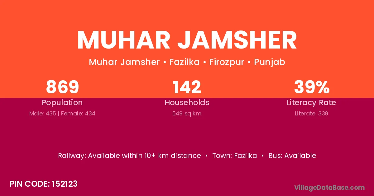Muhar Jamsher village has a total population of 869 people, of which 435 are males and 434 are females.