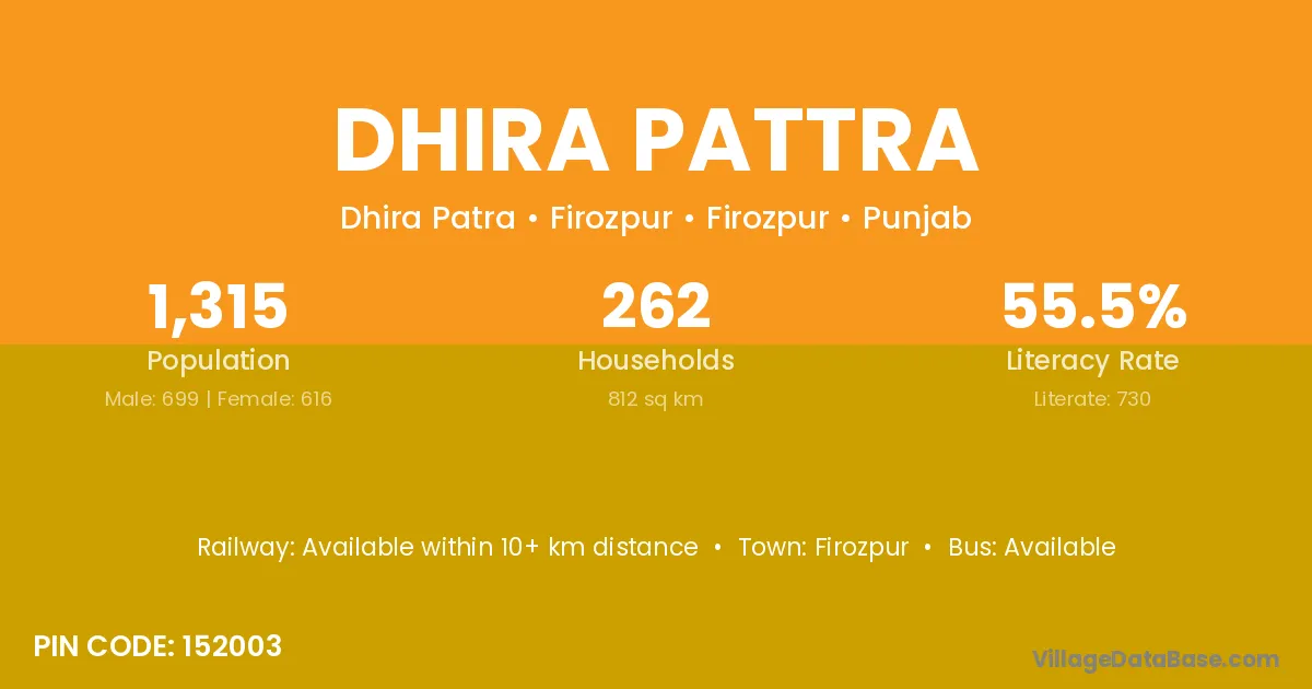 Firozpur is the nearest town to Dhira Pattra village for major economic activities