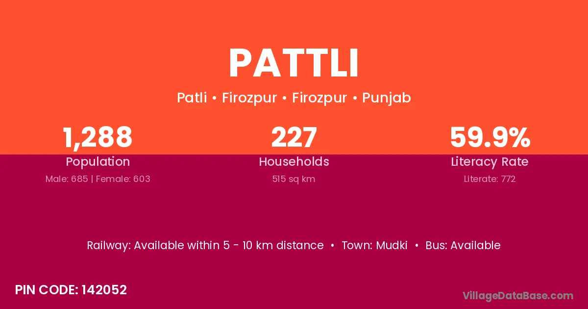 Pattli village has a total population of 1,288 people, of which 685 are males and 603 are females.