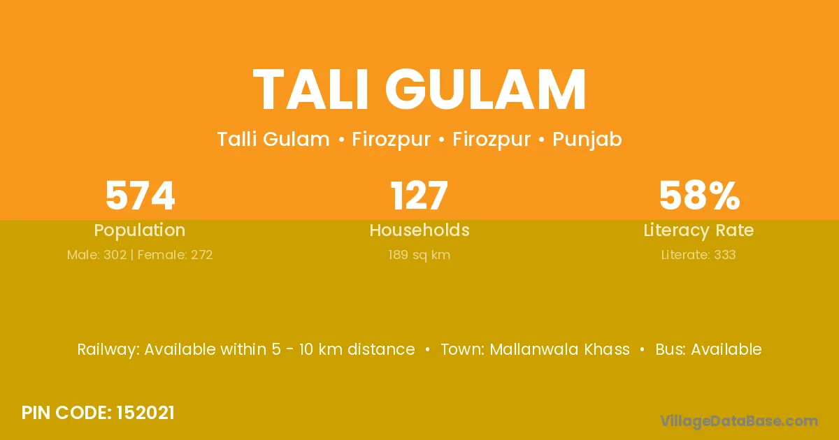 Mallanwala Khass is the nearest town to Tali Gulam village for major economic activities