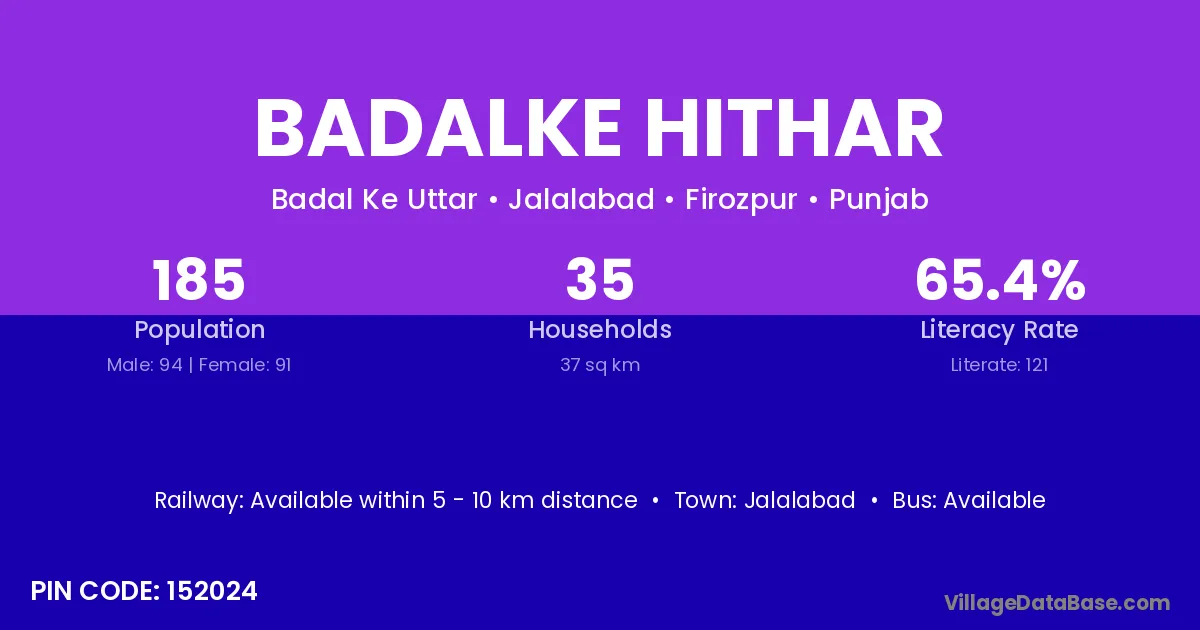Badalke Hithar village has a total population of 185 people, of which 94 are males and 91 are females.