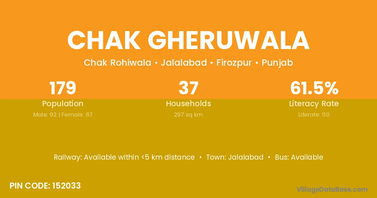 Chak Gheruwala village has a total population of 179 people, of which 92 are males and 87 are females.