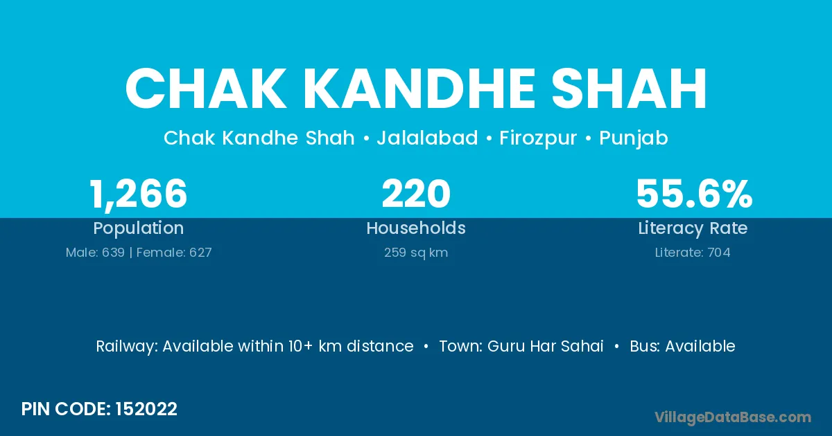 Chak Kandhe Shah village has a total population of 1,266 people, of which 639 are males and 627 are females.