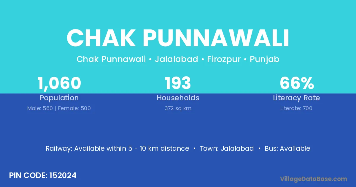 Chak Punnawali village has a total population of 1,060 people, of which 560 are males and 500 are females.