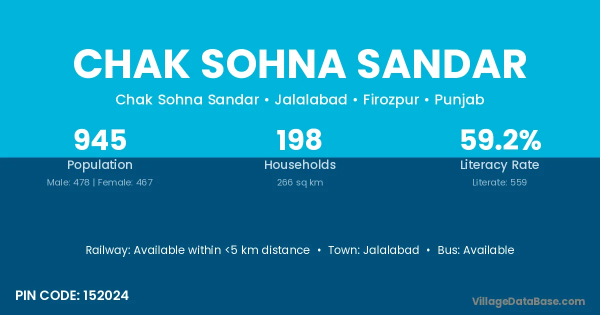 Chak Sohna Sandar village has a total population of 945 people, of which 478 are males and 467 are females.