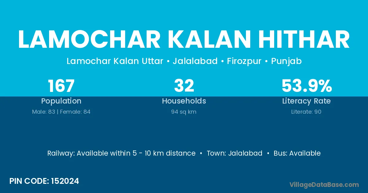 Lamochar Kalan Hithar village has a total population of 167 people, of which 83 are males and 84 are females.