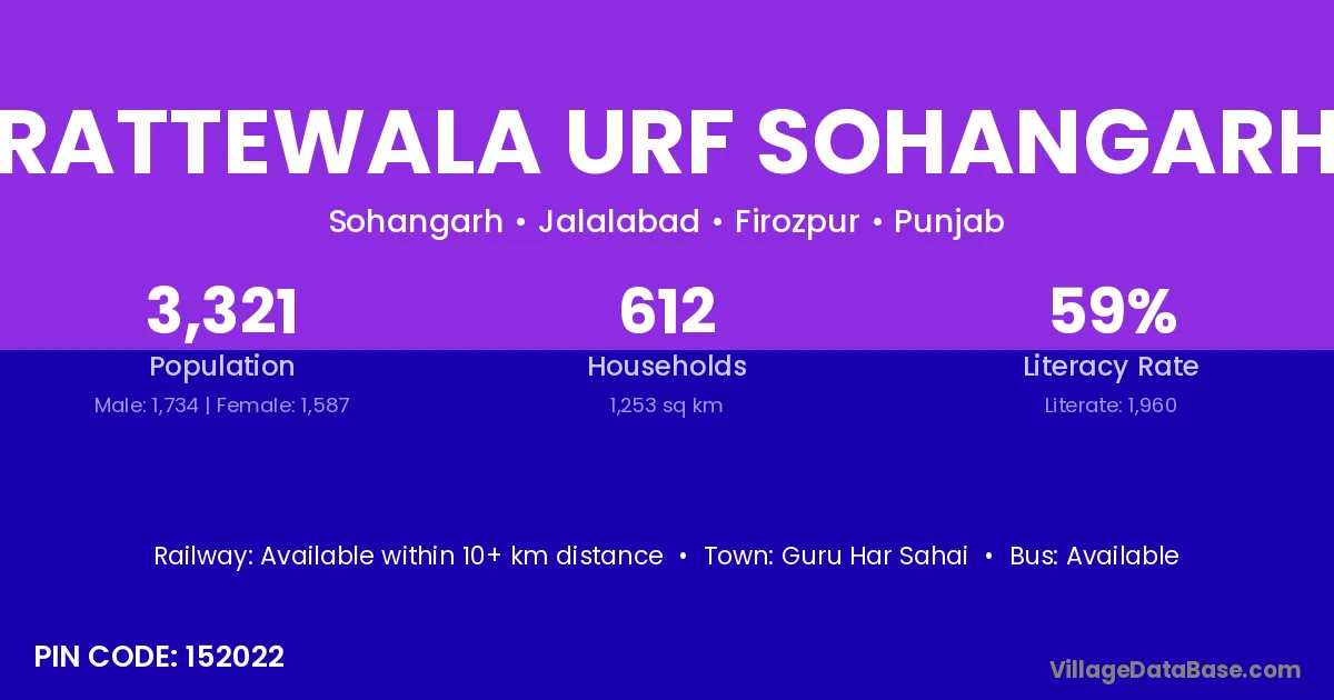 Rattewala Urf Sohangarh village has a total population of 3,321 people, of which 1,734 are males and 1,587 are females.