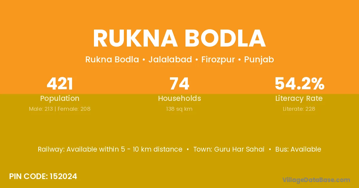 Rukna Bodla village has a total population of 421 people, of which 213 are males and 208 are females.