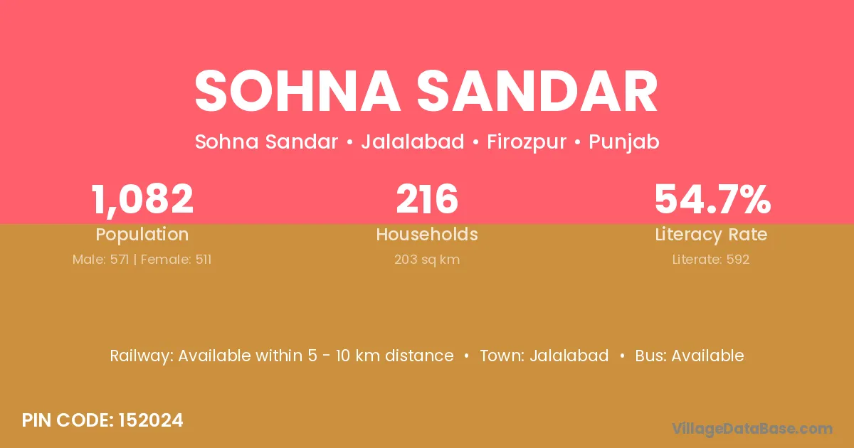 Sohna Sandar village has a total population of 1,082 people, of which 571 are males and 511 are females.