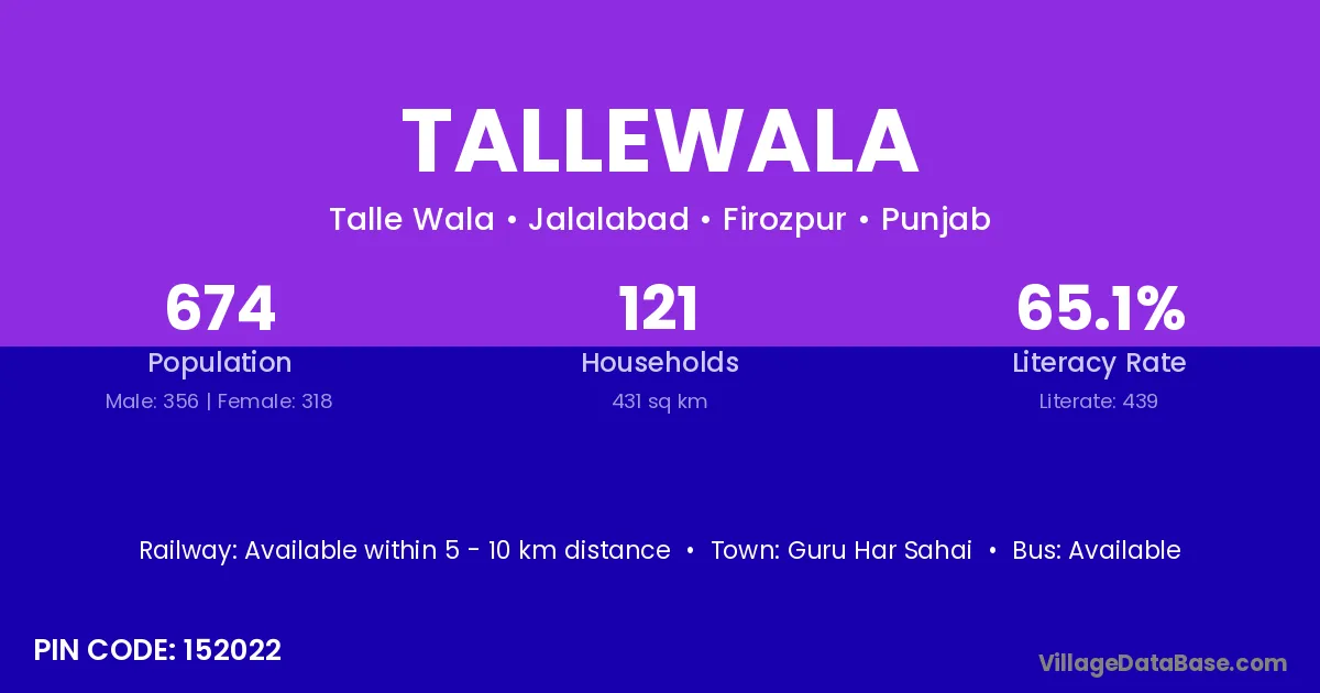 Tallewala village has a total population of 674 people, of which 356 are males and 318 are females.