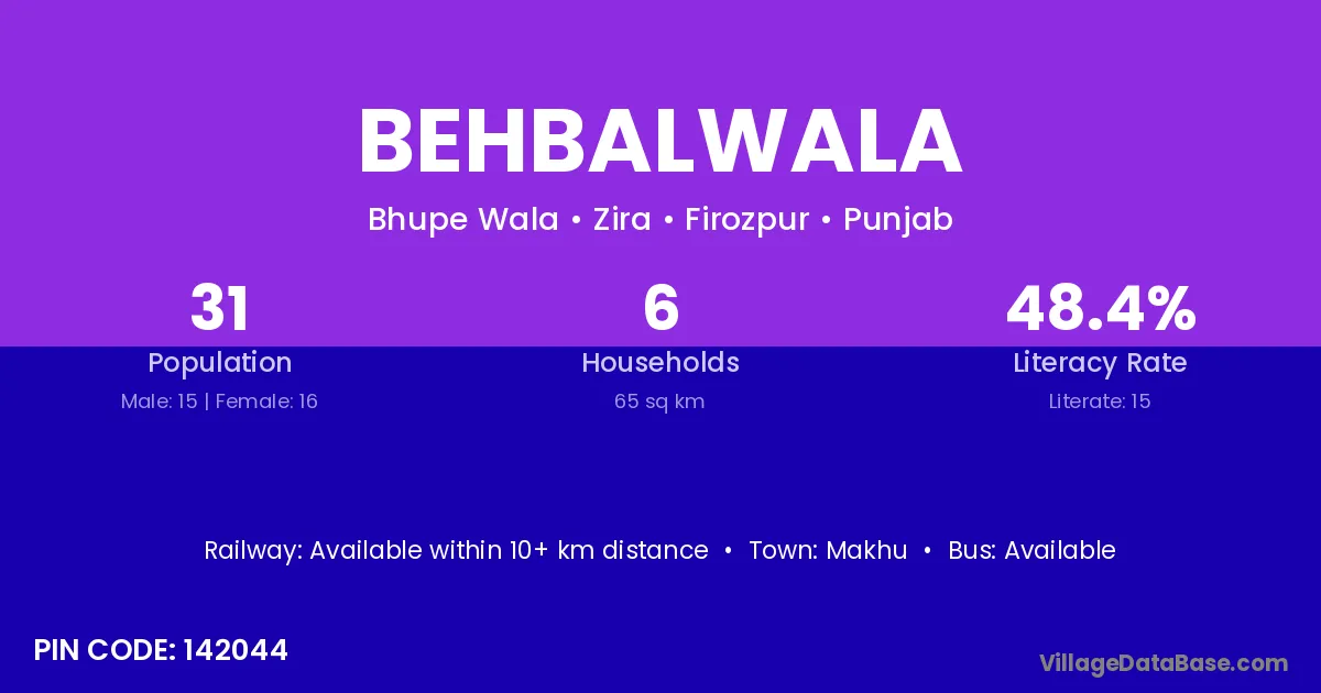 Behbalwala village has a total population of 31 people, of which 15 are males and 16 are females.