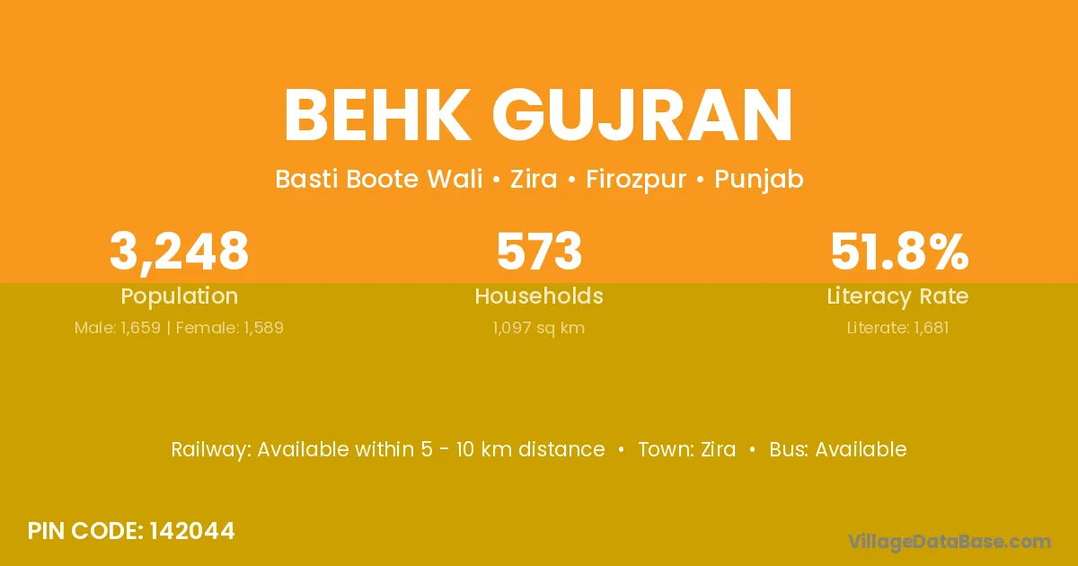 Behk Gujran village has a total population of 3,248 people, of which 1,659 are males and 1,589 are females.