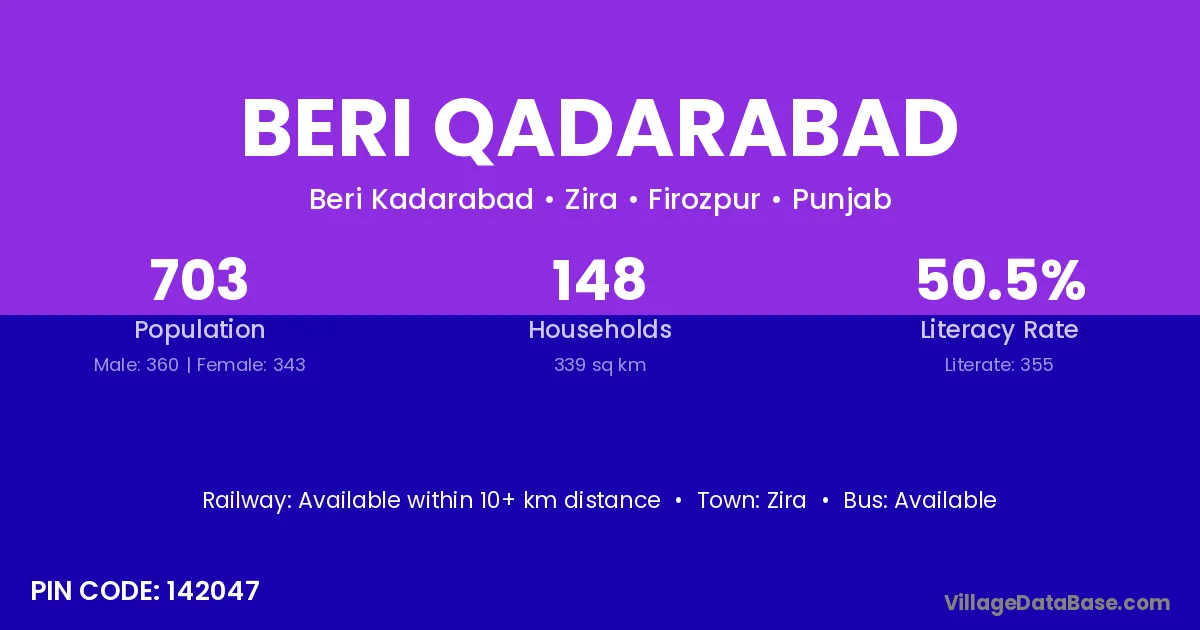 Beri Qadarabad village has a total population of 703 people, of which 360 are males and 343 are females.