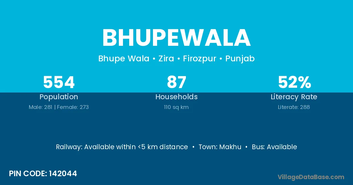 Bhupewala village has a total population of 554 people, of which 281 are males and 273 are females.