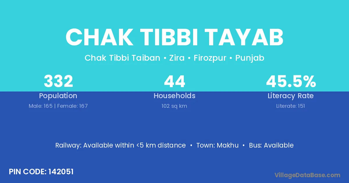 Chak Tibbi Tayab village has a total population of 332 people, of which 165 are males and 167 are females.