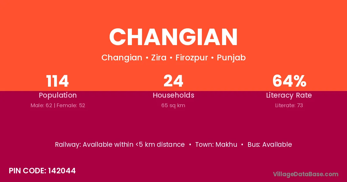 Changian village has a total population of 114 people, of which 62 are males and 52 are females.