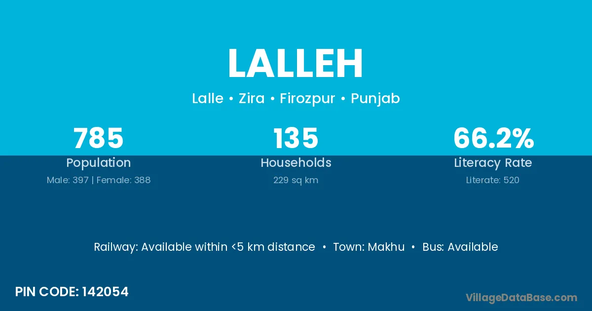 Lalleh village has a total population of 785 people, of which 397 are males and 388 are females.