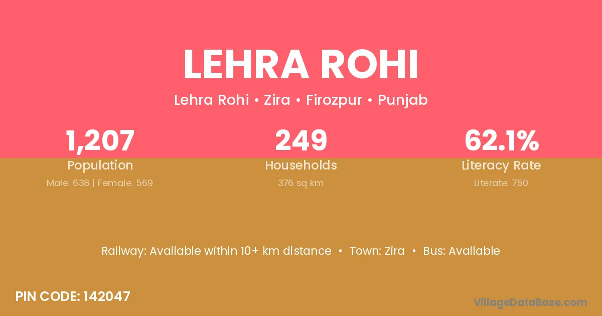 Lehra Rohi village has a total population of 1,207 people, of which 638 are males and 569 are females.
