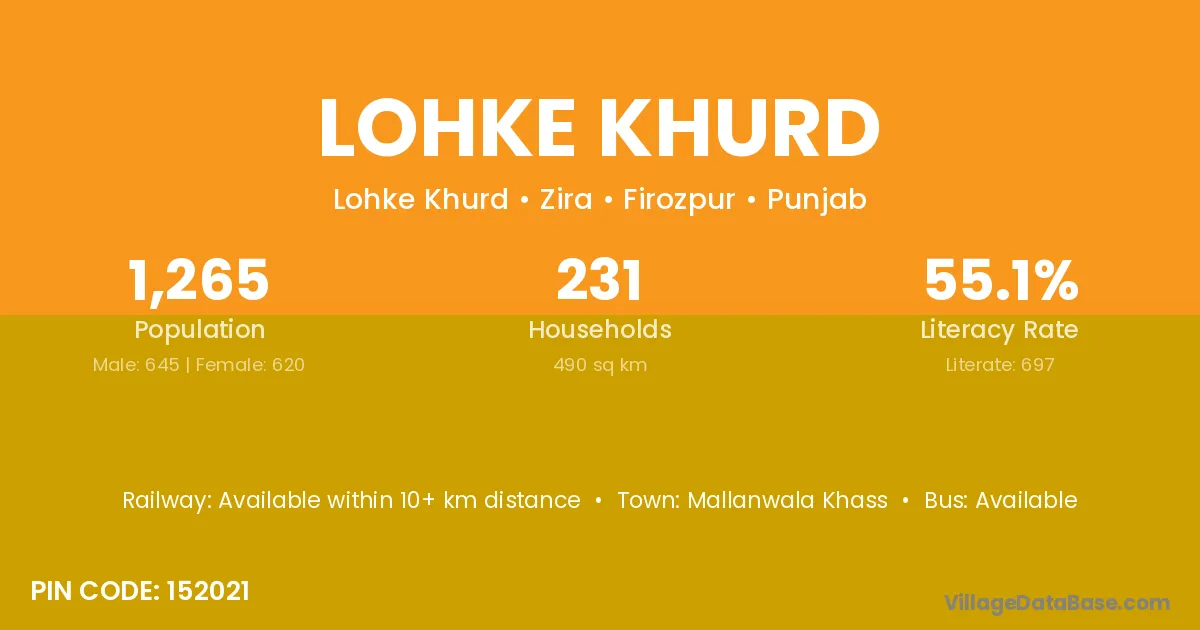 Lohke Khurd village has a total population of 1,265 people, of which 645 are males and 620 are females.