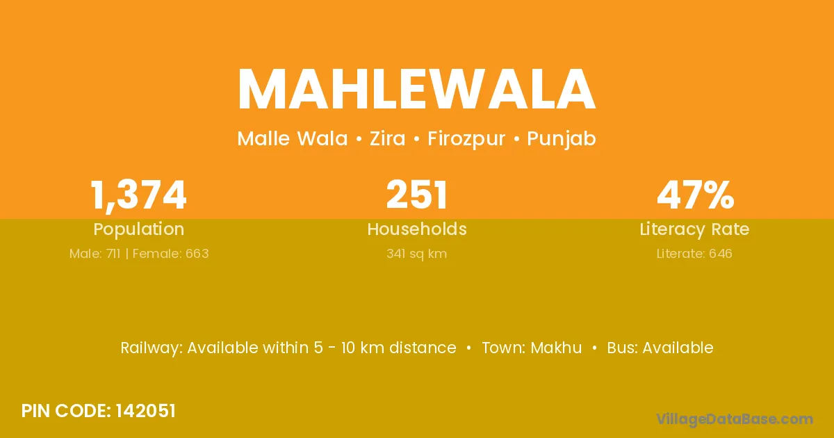 Mahlewala village has a total population of 1,374 people, of which 711 are males and 663 are females.