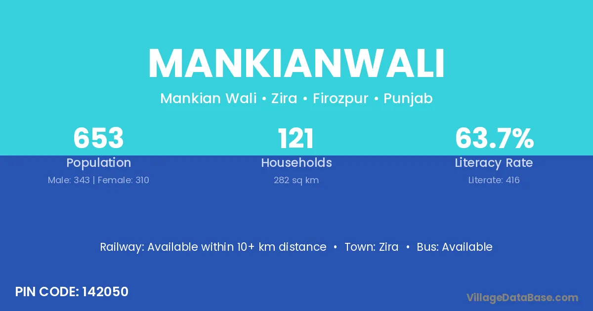 Mankianwali village has a total population of 653 people, of which 343 are males and 310 are females.