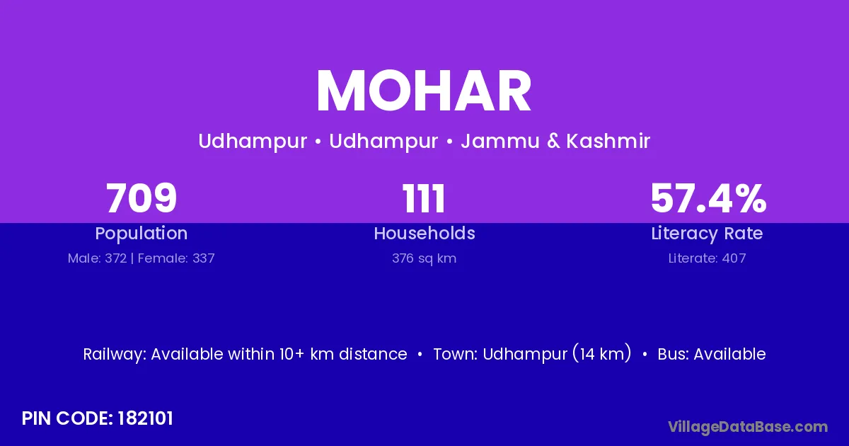 The literacy rate of Mohar village is 55.00%. Male literacy stands at 64.86% and female literacy at 43.94%.
