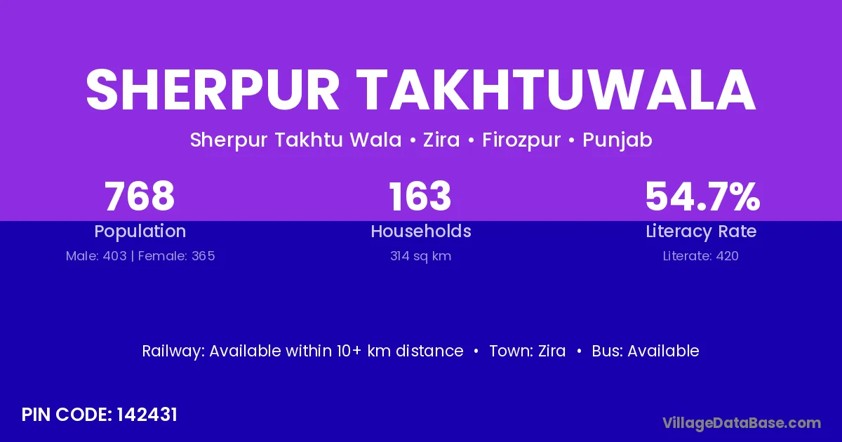 Zira is the nearest town to Sherpur Takhtuwala village for major economic activities