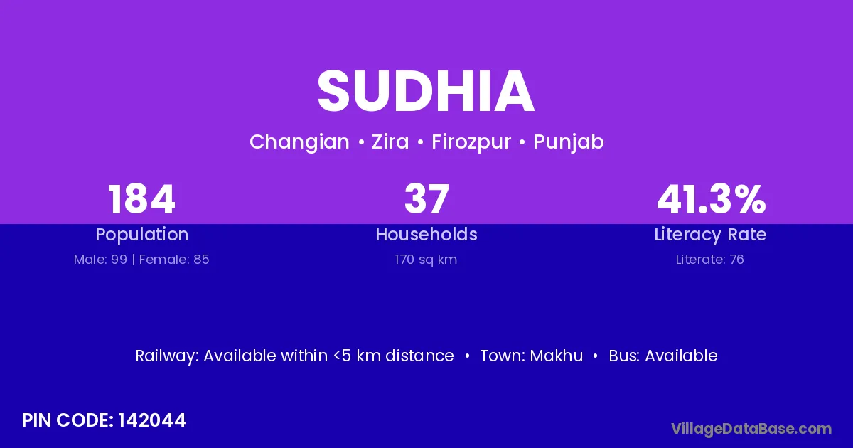 According to Census 2011 information, the village code of Sudhia village is 142044.