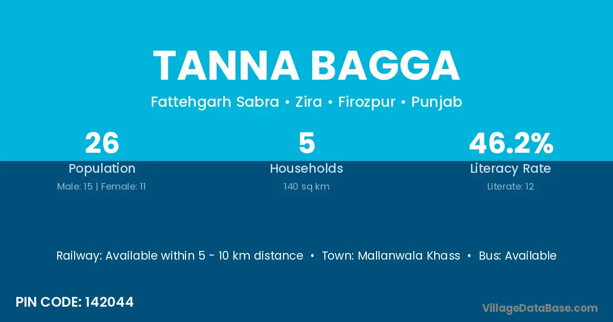 Tanna Bagga village has a total population of 26 people, of which 15 are males and 11 are females.