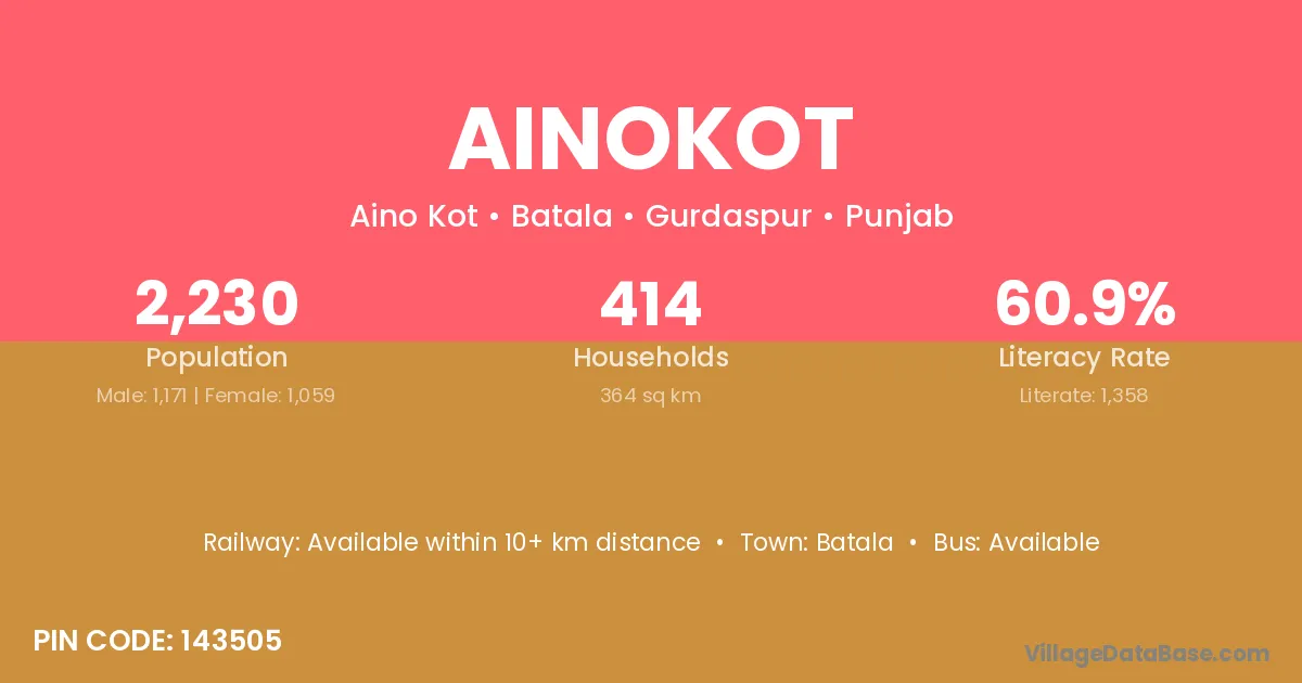 Ainokot village has a total population of 2,230 people, of which 1,171 are males and 1,059 are females.