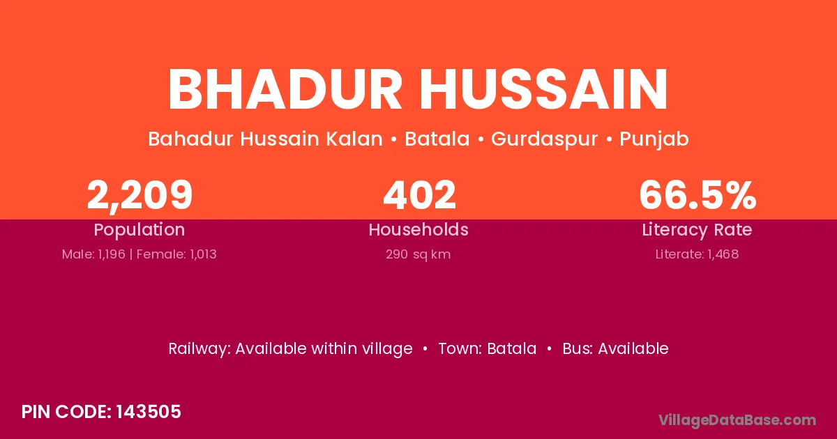 Bhadur Hussain village has a total population of 2,209 people, of which 1,196 are males and 1,013 are females.