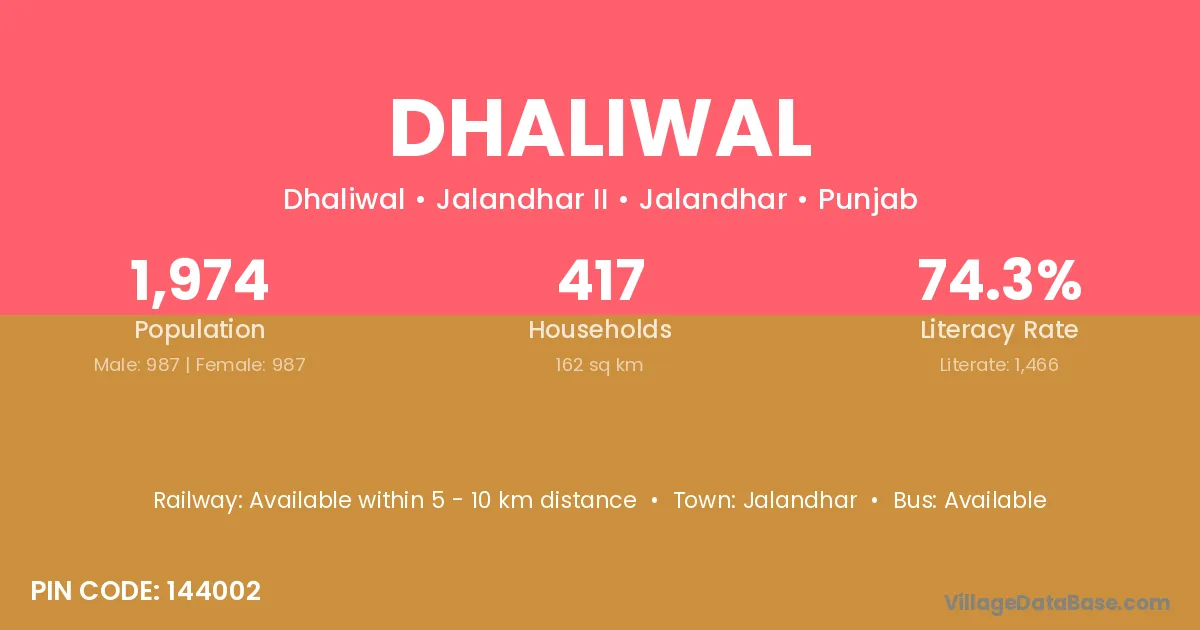 The literacy rate of Dhaliwal village is 67.86%. Male literacy stands at 70.64% and female literacy at 64.74%.